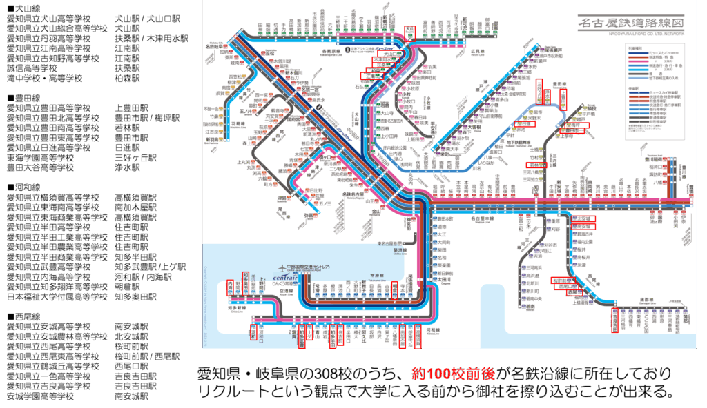 1日当たり約177万人・年間で6億4600万人の方が名鉄電車を利用するため、非常にリーチ力の高い媒体です。一人当たりのリーチコストは0.21円程とTVメディアと比べても高く、擦り込み効果も期待できます。また、名鉄沿線には約100校程の高校と30校程の大学が所在しているため、リクルーティングにも 効果が高く、弊社としてもイチオシの媒体です!