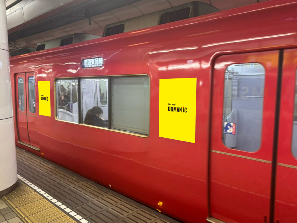 名鉄電車の車体に掲出される車体広告です。名鉄全線(特急車車両を除く)の一般車両に掲出されるため、 岐阜県や愛知県北部・南部など幅広く訴求を行うことが出来ます。 また、車体の乗降ドアの横に掲出され、屋外を走るため、乗降時はもちろん、歩行者や車を運転する方からの視認率も高い媒体です。